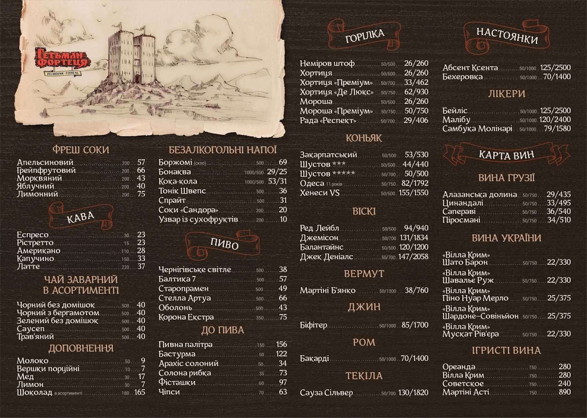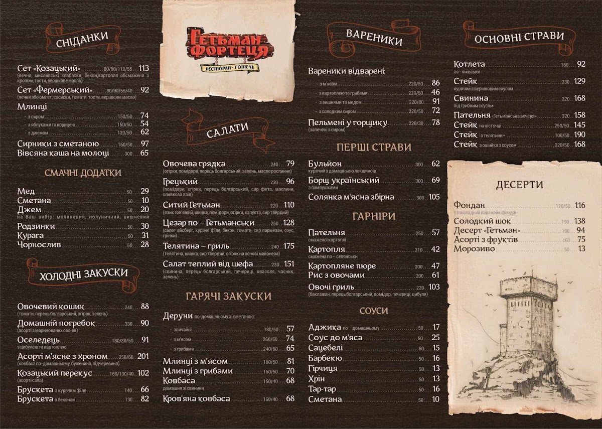 The menu at Hetman Fortetsia offers a delightful array of traditional Ukrainian dishes that showcase the region's rich culinary heritage. A standout on the menu is the Сырники, a deliciously soft and fluffy cheese pancake served with sour cream or jam, perfectly capturing the essence of Ukrainian comfort food. Another must-try is the Вареники С Творогом, a hearty dish of dumplings filled with cottage cheese, often paired with butter or sour cream, making for a satisfying and authentic experience. The restaurant also offers a variety of meat and fish dishes, including tender beef stews and grilled fish, each prepared with fresh, locally-sourced ingredients. The warm and inviting atmosphere of the restaurant enhances the dining experience, making it an excellent choice for anyone looking to enjoy a traditional Ukrainian meal in a cozy setting.